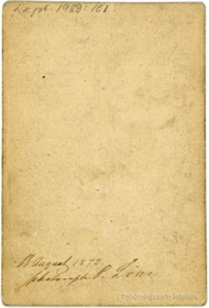 Karlmaður, sem stendur við hest. Á bakhlið myndar er skrifað með bleki: 18. August 1873. Photograph F. Löve.