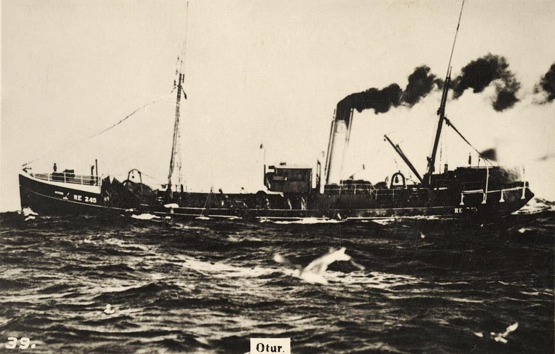 Úr myndaröðinni: Íslenzkar eimskipamyndir (39), sem fylgdu í Westminster sígarettupökkum. Otur RE 245, skip Oturs hf., Reykjavík. Togari.