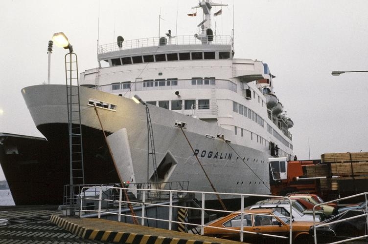 Edda við bryggju. Tvær frekar víðar myndir. Ljósm: BÁ. feb., 1985.