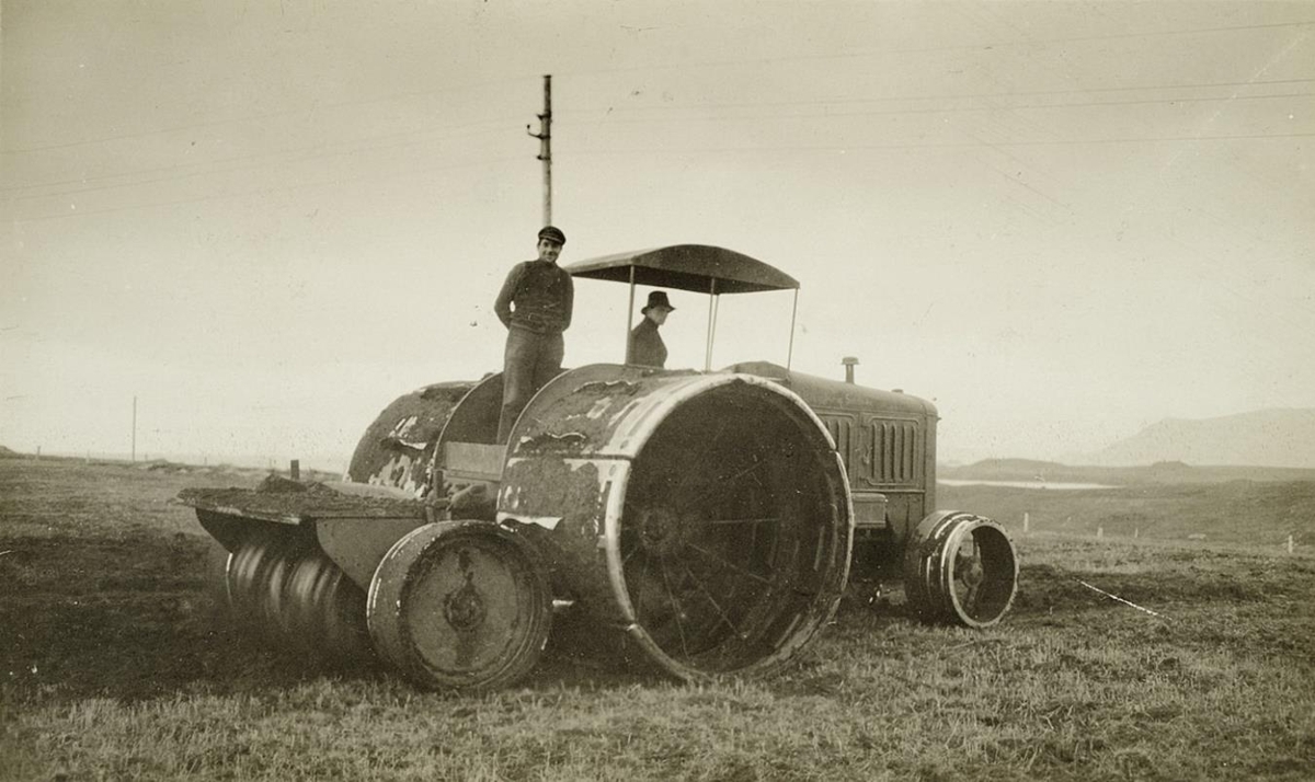 Á vélinni er þak yfir ökumanni sem situr við stýrið og annar karlmaður