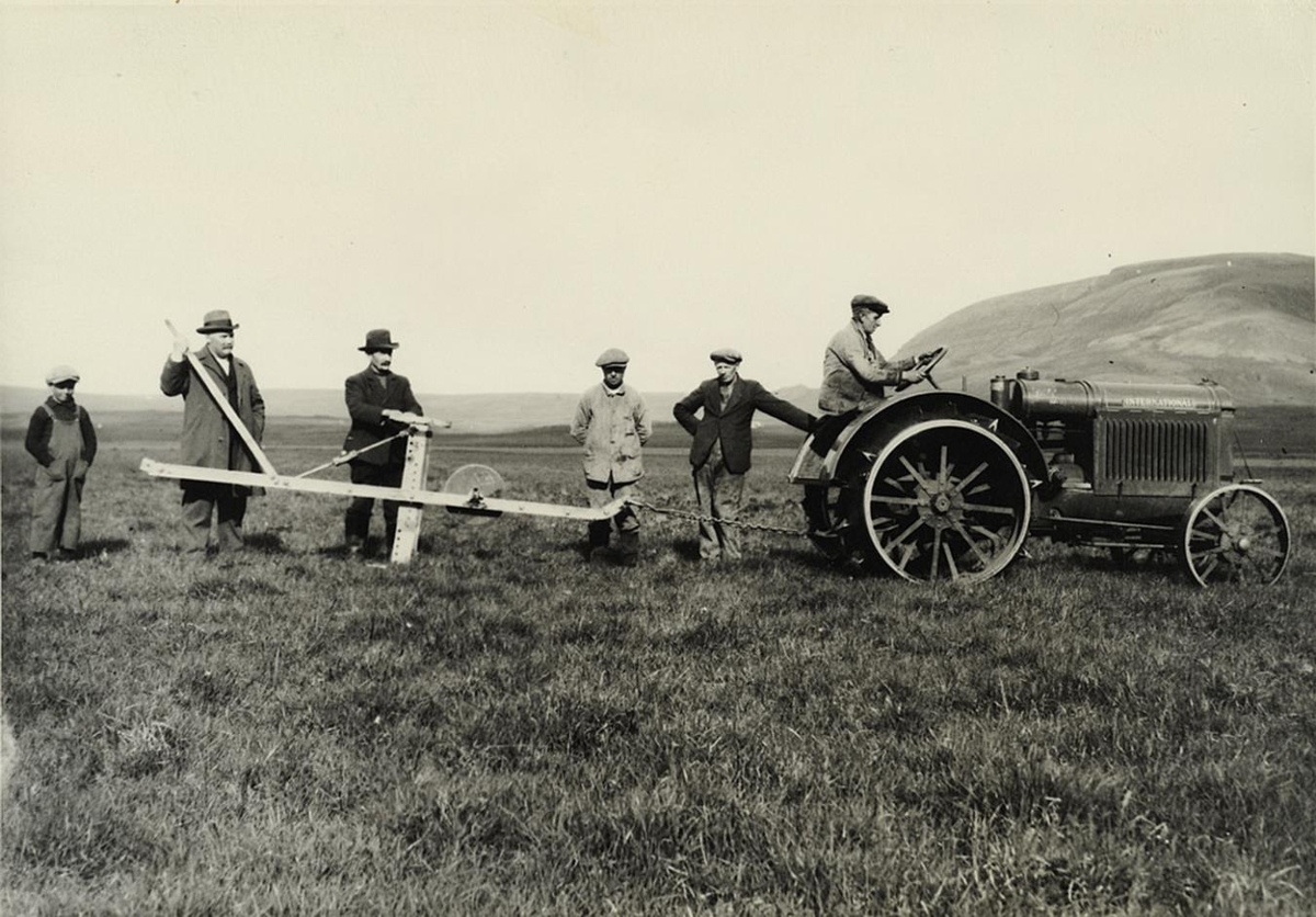 Harvester 10/20 gerð á járnhjólum með holræsaplóg aftaní. Við plóginn standa