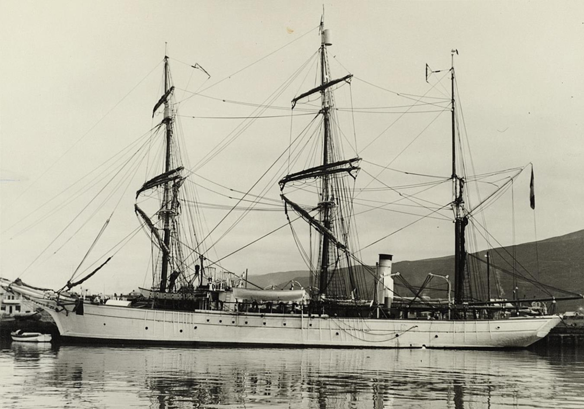 Myndin sýnir stórt, hvítmálað þriggja mastra seglskip við bryggju. Undir stefni þess er léttabátur. Á bakhlið er skrifað: Myndin er tekin á Akureyri - að mig minnir sumarið sem skipið fórst. Árni G. Eylands. Skýring: Porquoi-Pas á Akureyri.