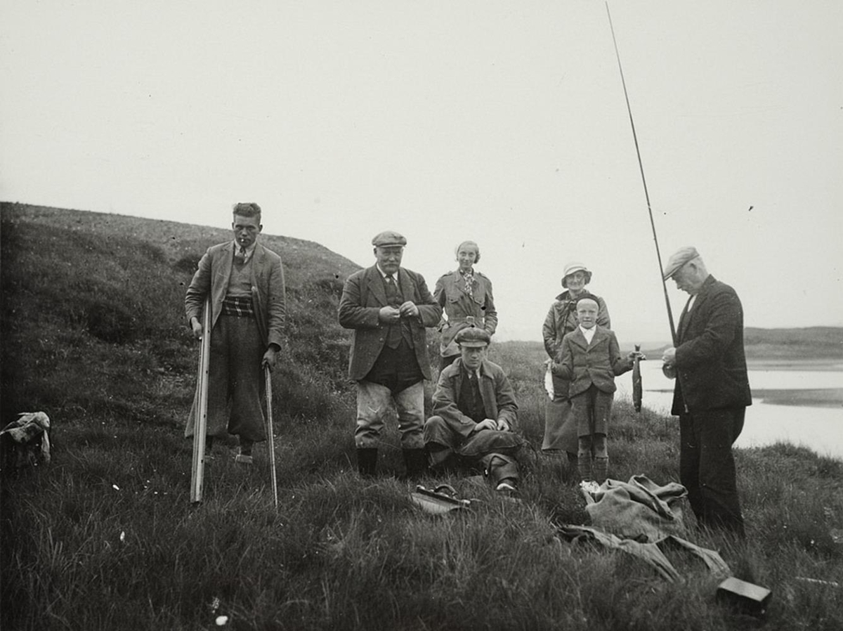 Myndin sýnir hóp fólks við stangveiðar. Skýring: Við veiðar í Borgarfirði. Halldór Vilhjálmsson á Hvanneyri, Margit Eylands, Iðunn og Árni.