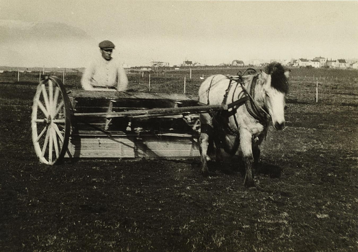 dreginn er af hesti og gengur karlmaður með derhúfu á eftir honum. Í baksýn