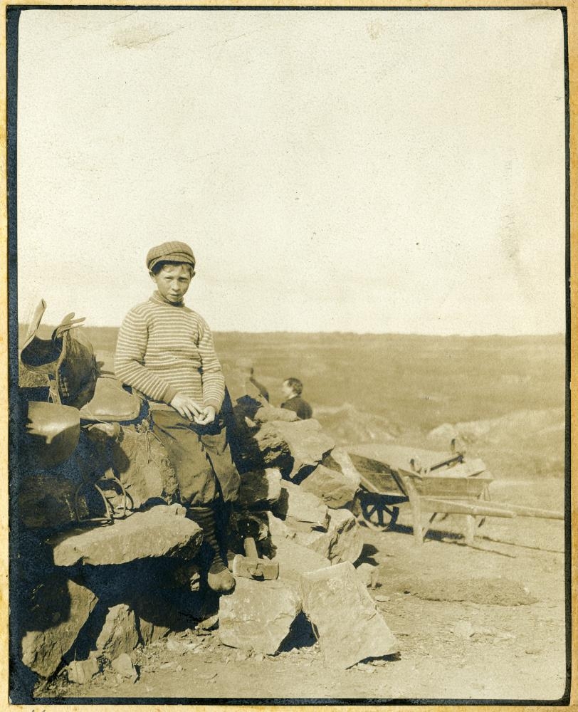 Strákar á hlöðnum vegg eða grjótbing.
