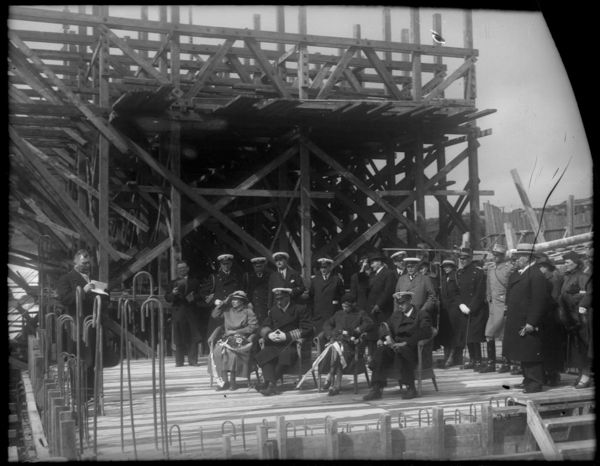 Fremst sitja Kristján X, drottning og tveir aðrir. Steypustyrktarjárn stendur
