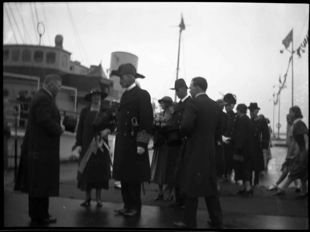 borgarstjóri heilsar Kristjáni X. Fleiri fyrirmenn í baksýn.