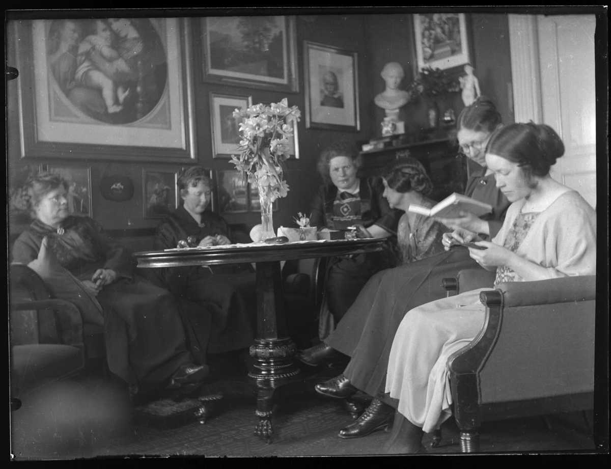 Sex konur sitja saman umhverfis borð í stofu og er ein að lesa en sumar