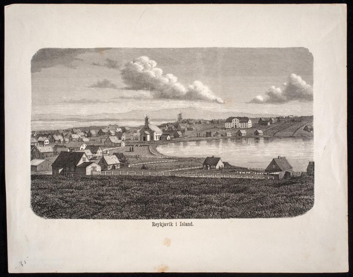 Trjeskurðarmynd af Reykjavík, sjeð af Hólavelli. Hægra megin neðst CB, líklega upphafsstafir málarans Carl Baagöe; vinstra megin neðst AK sc, merki þess, er skar myndina í trje. Stærð 14,1 x 23,5; blaðið 22,2 x 28,4 cm.