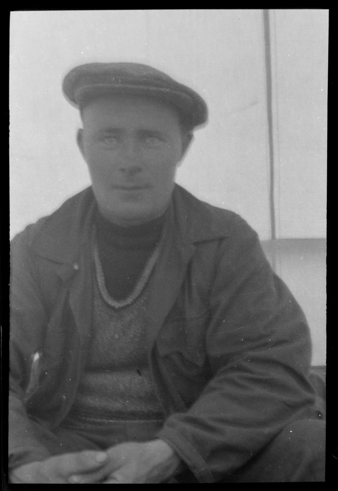 79. Maður með derhúfu við tjald. Pétur Olsen, Prestshúsi, Eyrarbakka.