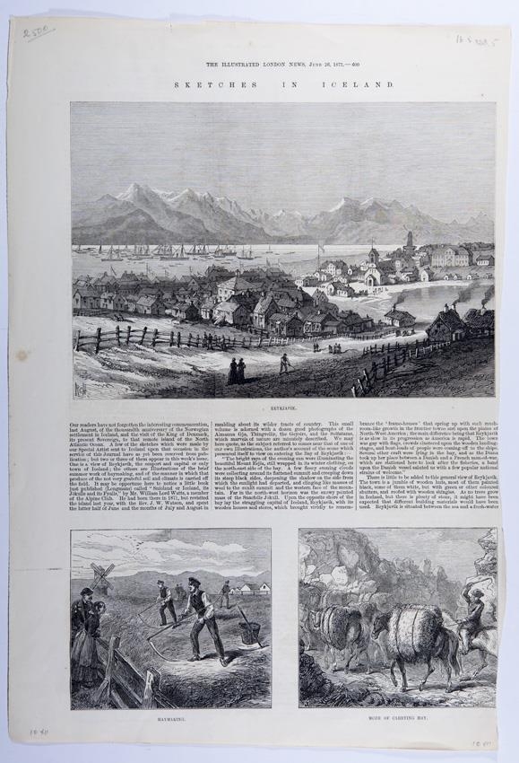 Efst er mynd af útsýni yfir Reykjavík „Reykjavík"“. Neðst á blaðinu eru tvær myndir minni hlið við hlið og sýna heyskap á Íslandi, sláttumenn. „Haymaking“ og heyflutning á hestum. „Mode of carrying hay“.