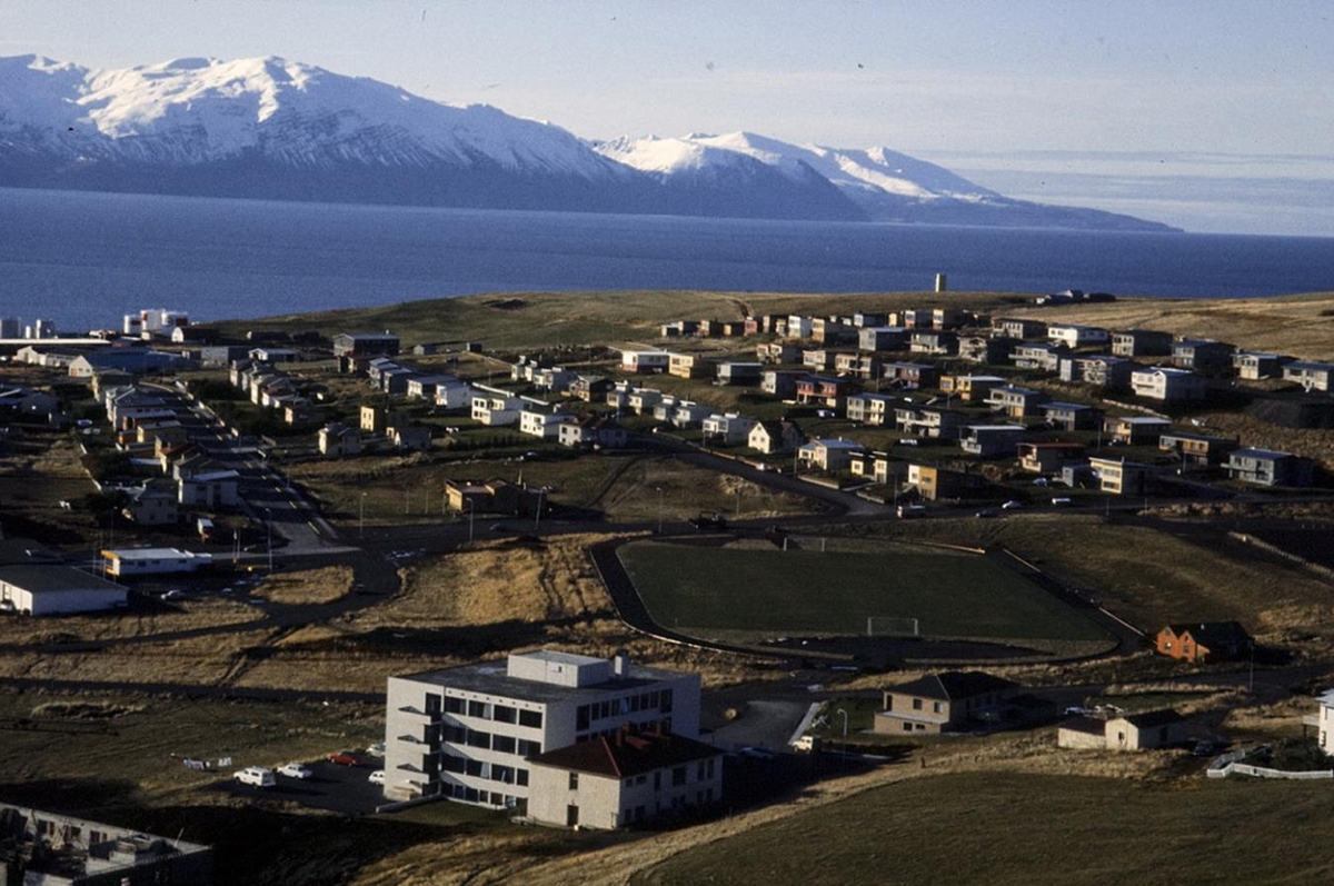stórhýsi fremst. (skóli). Íþróttavöllur.