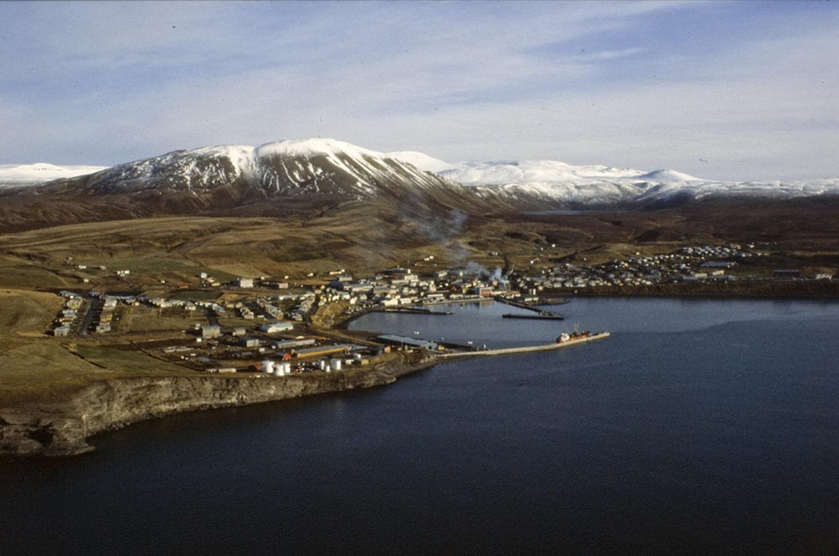Húsavík, séð úr vestri. Þröng mynd. Umhverfi sést vel.