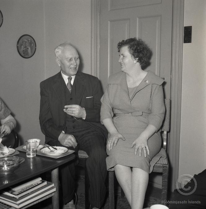 Karlmaður og kona sitja í stólum í stofu. Fyrir framan þau er sófaborð og á því bollar, diskar og bakkar.