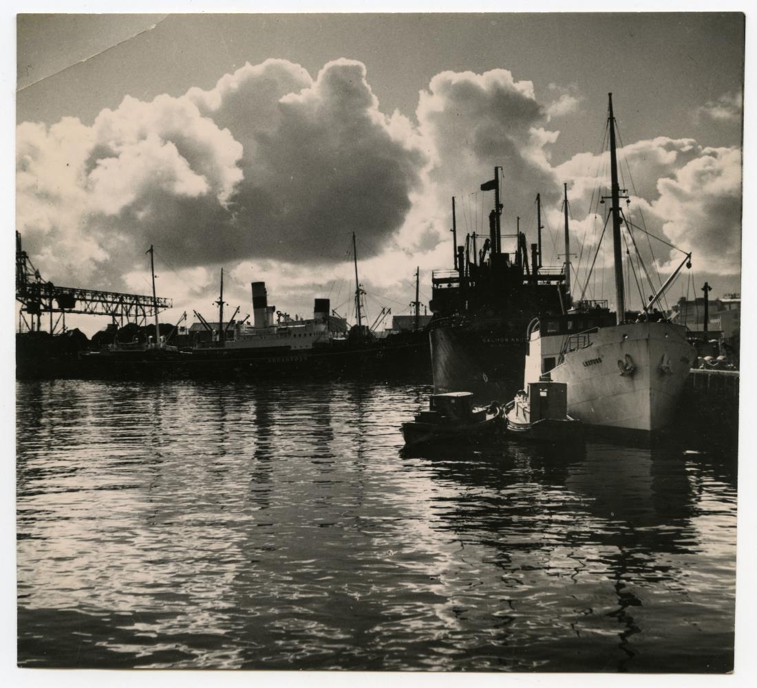 í spegilsléttri höfn við hlið lítils flutningaskips sem liggur við bryggju,