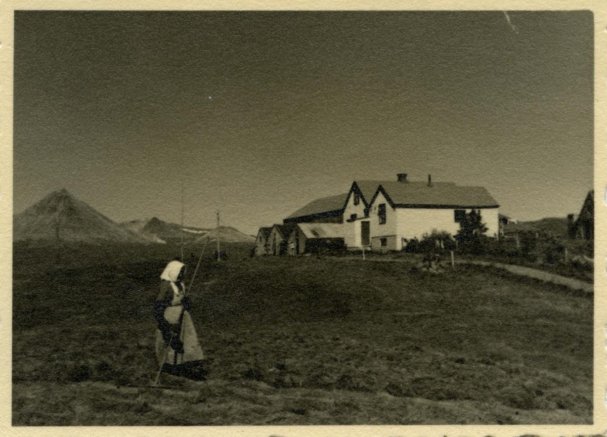 Kona með skuplu á höfði rifjar heyflekk með hrífu, í baksýn er íbúðar- og útihús á litlum sveitabæ. Í bakgrunni t.v. er pýramídalagað, ljósleitt fjall.