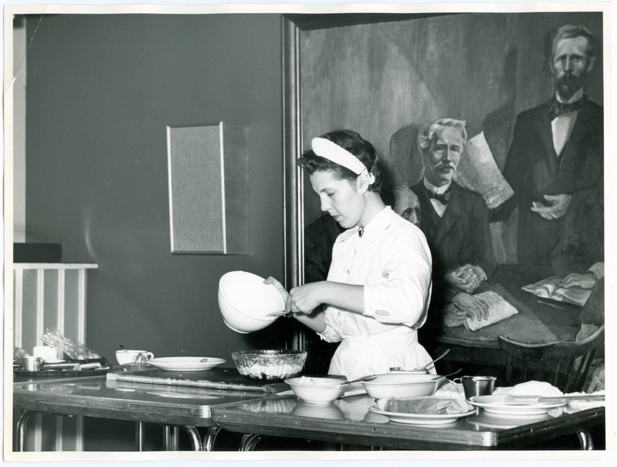 Hilmarsdóttir húsmæðrakennari. i-h. Áhugasamar konur fylgjast með í sal.