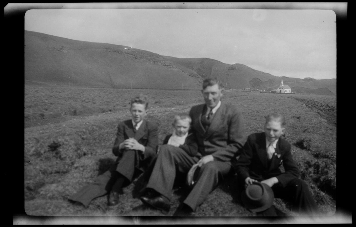 Eyjólfur Högnason ásamt sonum sínum, kirkja í baksýn.