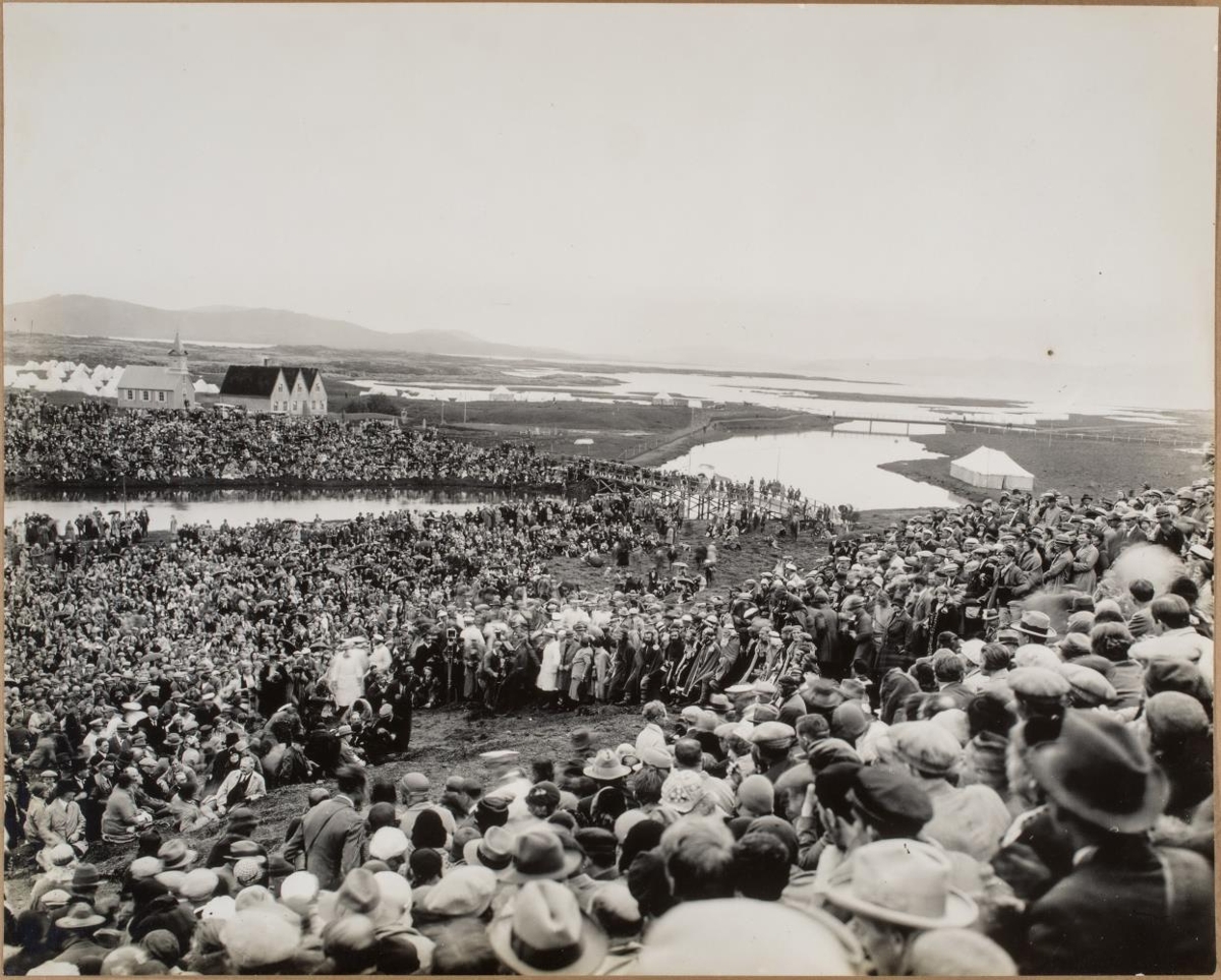 Frummynd, tekin yfir mannfjölda á Alþingishátíðinni á Þingvöllum 1930. Fólk hefur raðað sér og komið fyrir á hverjum þeim auða blett sem var að finna, m a. úti á göngubrú yfir Öxará. Fremst á mynd og að miðju fyllir mannfjöldi myndflöt og neðarlega fyrir miðju má sjá hvar er autt pláss þar sem ljósmyndarar hafa stillt upp fólki í fornmannabúningum til myndatöku. Um miðja mynd rennur svo Öxará í farvegi sínum, samkomutjald er á hægri bakka fyrir aftan mannfjölda. Hinu megin ár, fyrir frama kirkju og prestsetur, er einnig fjöldi fólks og á bak við prestsetur og kirkju sér í tjaldborg sem slegið hefur verið upp og þar á bak við Öxará og Þingvallavatn. Vel má greina fatnað fólks á mynd og móta þannig sýn á tísku og tíðaranda þessa tímabils. Þá má einnig greina mörg andlit í fólksmergðinni.
