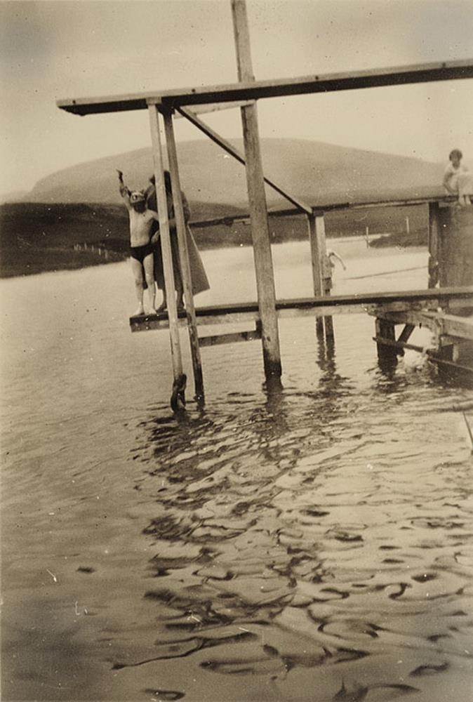 og leiðbeinir honum um sundtökin. Barn veður í ánni (ber í stólpa) og stelpa