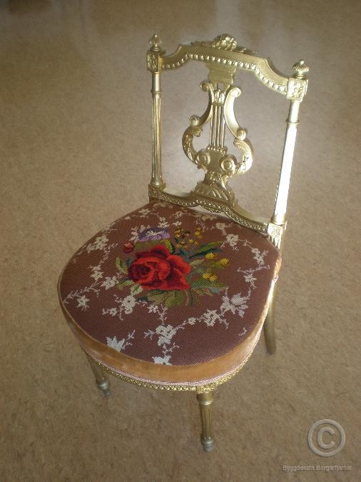 Gylltur lítill píanóstóll, með útsaumaðri setu með rósamynstri. Hæð stólsins: 84 cm. Mesta breidd setu: 44,5 cm. Ástand: gott.