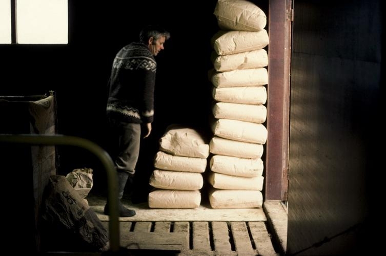 fóðursekki o.fl. út úr flutningabíl. Frekar þröngar myndir.