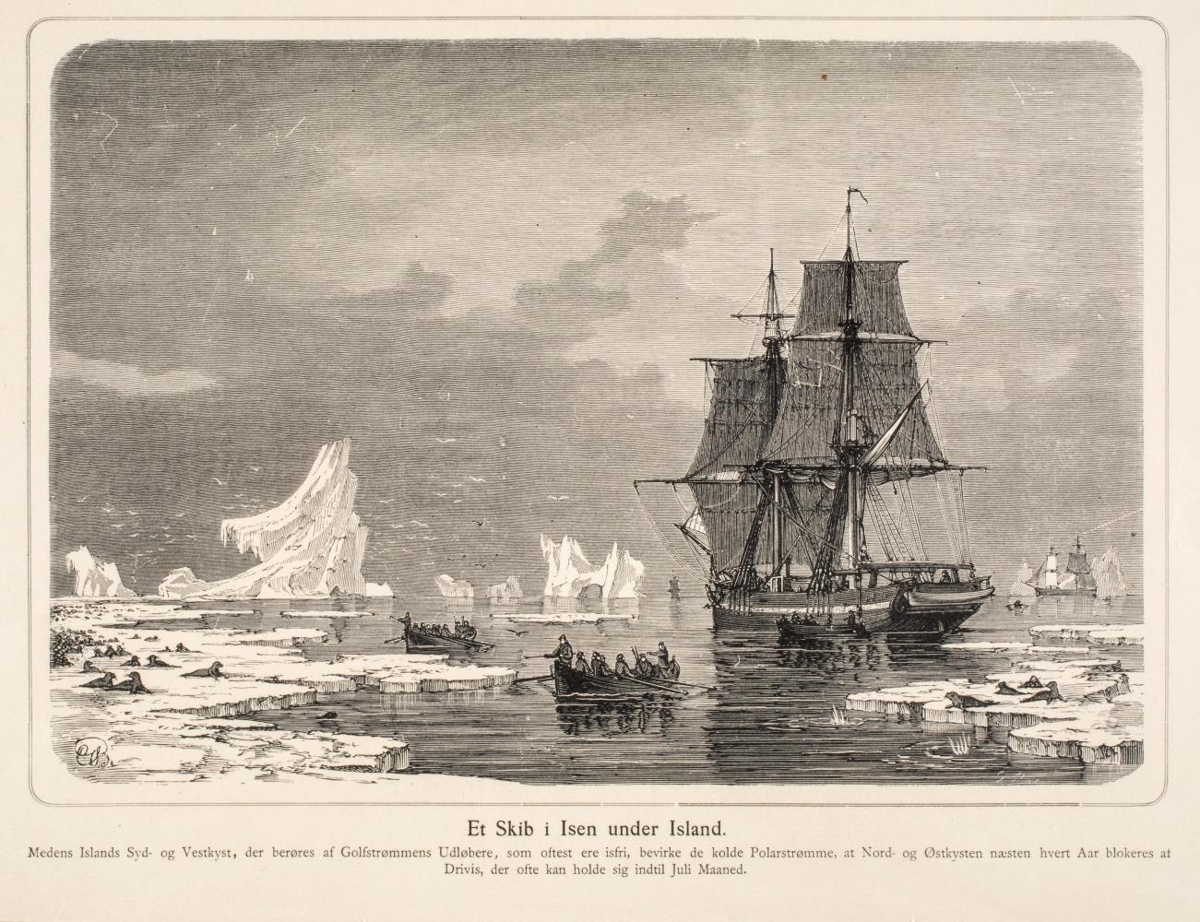 Prentmynd 27 x 35 cm.: Skip í hafís við Ísland. Selir á ísnum. "Et Skib i Isen under Island". Neðst t.v. á myndinni er fangamarkið CB, sem merkir á efa Carl Baagöe.