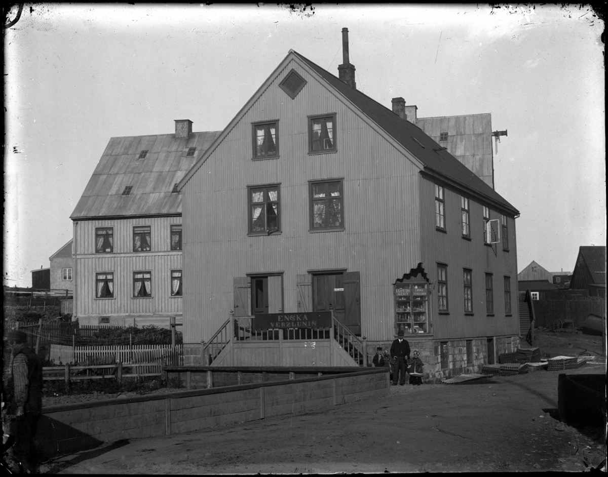 Þriggja hæða hús með kjallara, á tröppum hússins er skilti með áletruninni: ENSKA VERZLUNIN, sér í verslunarvöru í hornglugga, staflar af bárujárni úti fyrir. Maður með 3 börn stendur við húshornið. Sér í næstu hús, grindverk, þvottasnúru, handvagn og báta. Th. Thorsteinsson með börn sín Geir og tvíbrana Guðrúnu og Hildi (f. 1890).