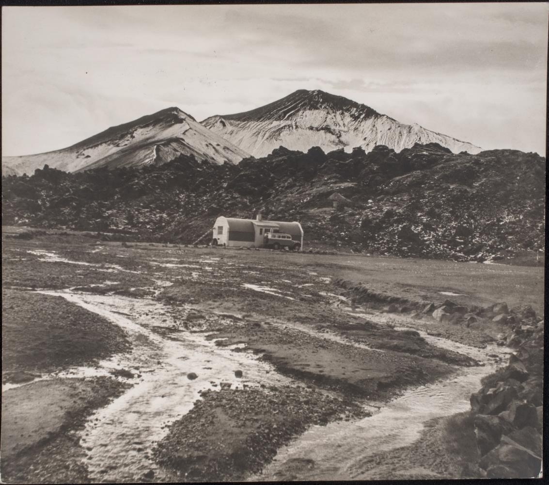 Mynd frá Landmannalaugum og skáli fyrir miðri mynd er sennilega skáli Ferðafélags Íslands og fjall á bak við Bláhnúkur. - Myndir 136-180 eru úr möppu sem send hefur verið til Þýskalands af FIAL og samanstendur hún af 45 myndum eftir íslenska áhugaljósmyndara. Móttökuaðili, Verband Deutzcher Amateur Fotografen, hefur stimplað nafn sitt á bak mynda, svo og ártalið 1963.