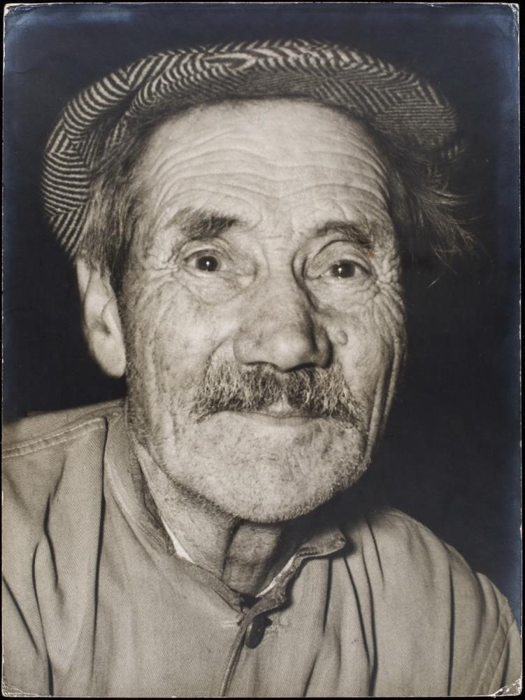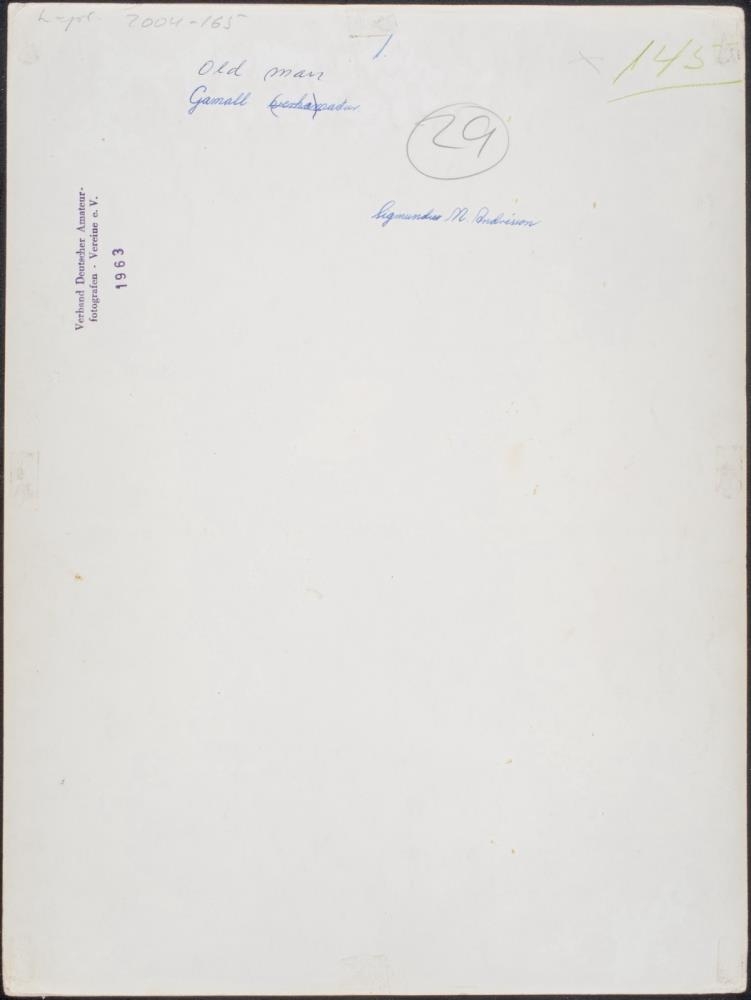 Gamall maður, að sjá, snýr andliti beint að myndavél. Mynd er tekin líkt og hefðbundin passamynd, andlit fyllir að mestu út í flöt og skorið af við axlir og viðbein. Maður er í e k. samfesting hnepptum upp í háls, og með pottlok á höfði. Hann er hrukkóttur nokkuð svo og með yfirvaraskegg og skegghýjung. - Myndir 136-180 eru úr möppu sem send hefur verið til Þýskalands af FIAL og samanstendur hún af 45 myndum eftir íslenska áhugaljósmyndara. Móttökuaðili, Verband Deutzcher Amateur Fotografen, hefur stimplað nafn sitt á bak mynda, svo og ártalið 1963.