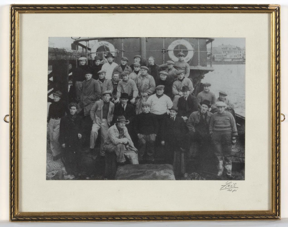 Innrömmuð ljósmynd af áhöfninni á togaranum Júní GK 345. Aftan á myndina er skrifað MARK 18.