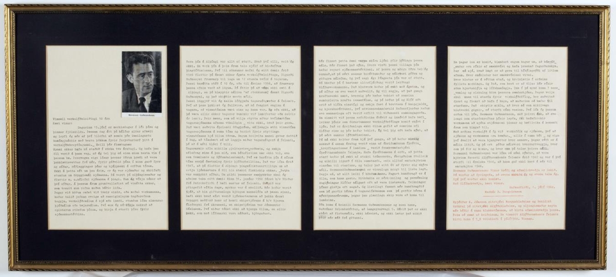 Innrömmuð mynd af Hermanni Guðmundssyni, kt. 1506143339, fyrrv. alþingismanni og framkvæmdastjóra í Hafnarfirði, ásamt afmælisgrein um hann, þ.e. úrklippa úr Vinnunni í júlí 1964. Greinin er skrifuð af Markúsi B. Þorgeirssyni. Aftan á myndina er skrifað MARK 56. Vantar glerið.