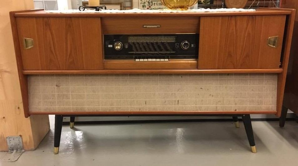 Radíófónn, plötuspilari og útvarp í sérsmíðuðum tekkskáp, frá 1961. Tækin frá Edda Radiofabrikk A/S í Noregi.