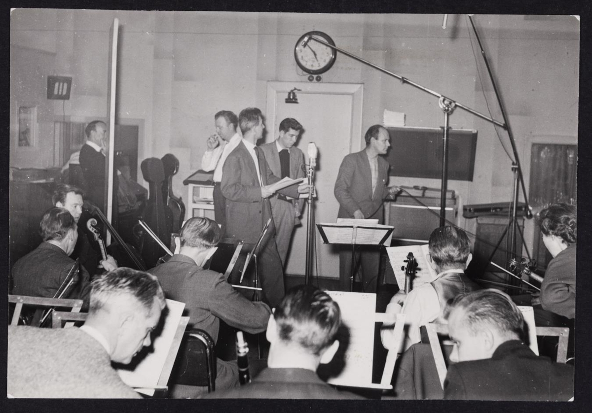 Myndir af starfsfólki RÚV, skemmtikröftum o.fl. árið 1958. (Ártal á dagatali á mynd 1240). Upptaka á barnaleikriti með aðstoð útvarpshljómsveitar. Guðmundur Pálsson, Bessi Bjarnason og Knútur Skeggjason.