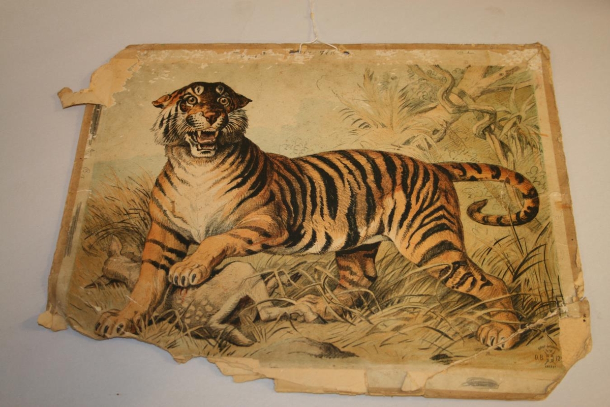 Kennsluspjald frá Gerðaskóla í Garði, framleitt í Danmörku. Myndir á báðum hliðum spjaldsins sem sýna dýr, villt dýr, húsdýr, búskaparhætti, bændur og búalið.