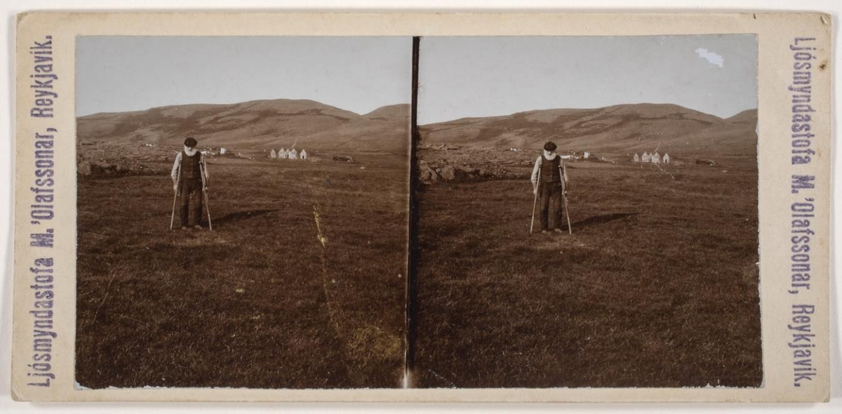 Karlmaður gengur við hækjur. Fjær er sveitabær.
