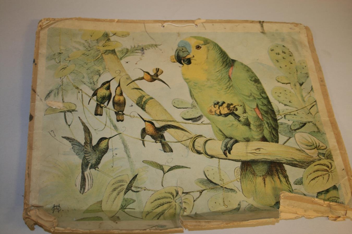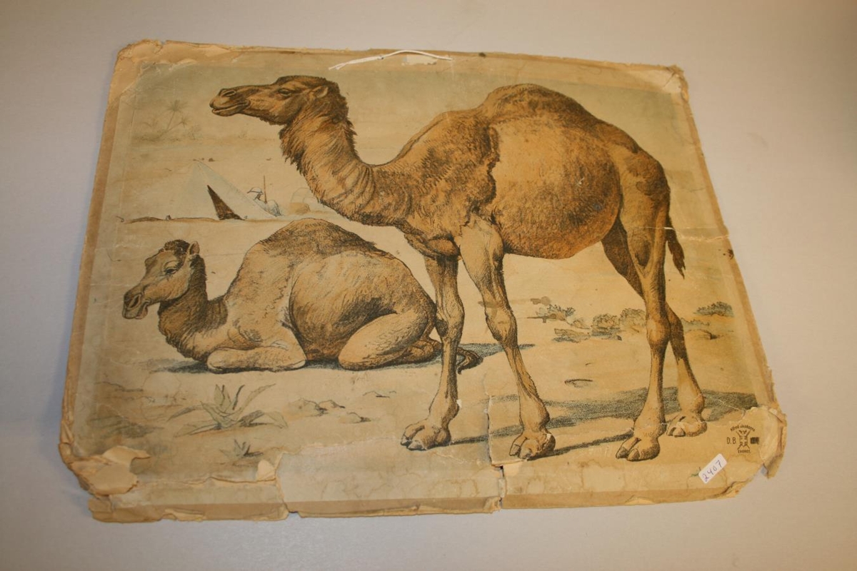 Kennsluspjald frá Gerðaskóla í Garði, framleitt í Danmörku. Myndir á báðum hliðum spjaldsins sem sýna dýr, villt dýr, húsdýr, búskaparhætti, bændur og búalið.