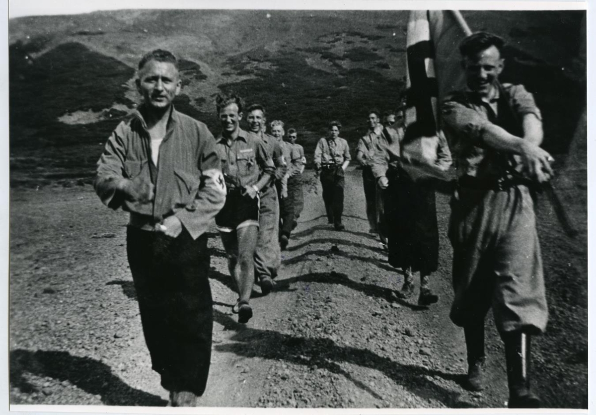 með merki nasista, hakakrossinn, á handlegg. Sá fremsti ber fána með sama