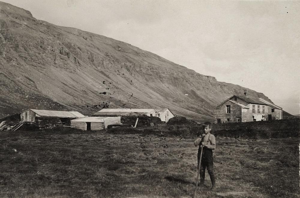Bær undir fjallshlíð. Útihús og steinsteypt íbúðarhús. Drengur í forgrunni.