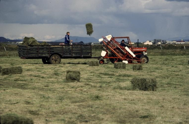 Nokkrar myhndir af hirðingu heybagga á túni. Á myndunum sjást dráttarvél, heyvagn og baggatína. Frekar víðar myndir. Ljósm: ? Ágúst/1983.