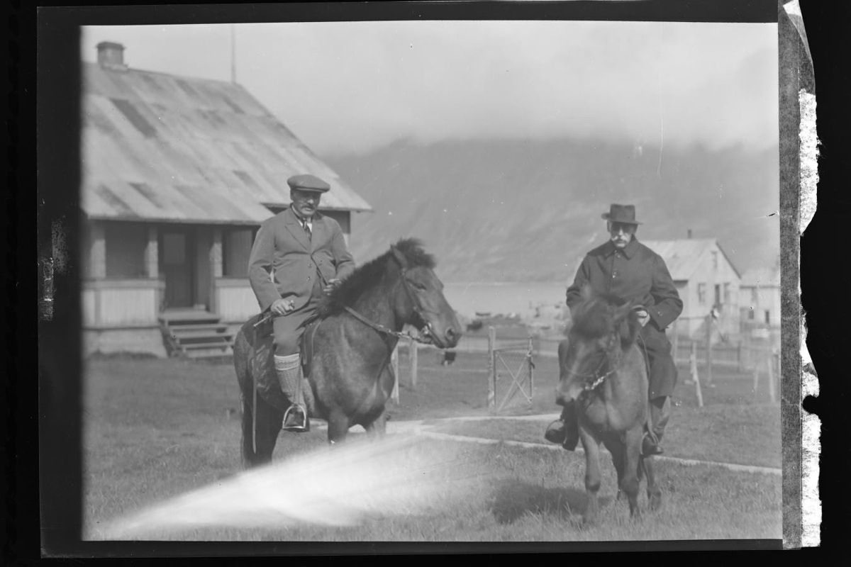 Siglufjörður. Hestamenn framan við Westenshús. Guðmundur Hannesson, bæjarfógeti, t.v.