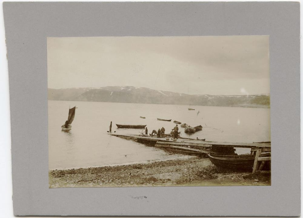 Bátabryggja og bátar á Geirseyri við Patreksfjörð. Horft suður yfir fjörðinn til Kvígindisdals og Vatnsdals. Ath. að myndin er spegluð.
