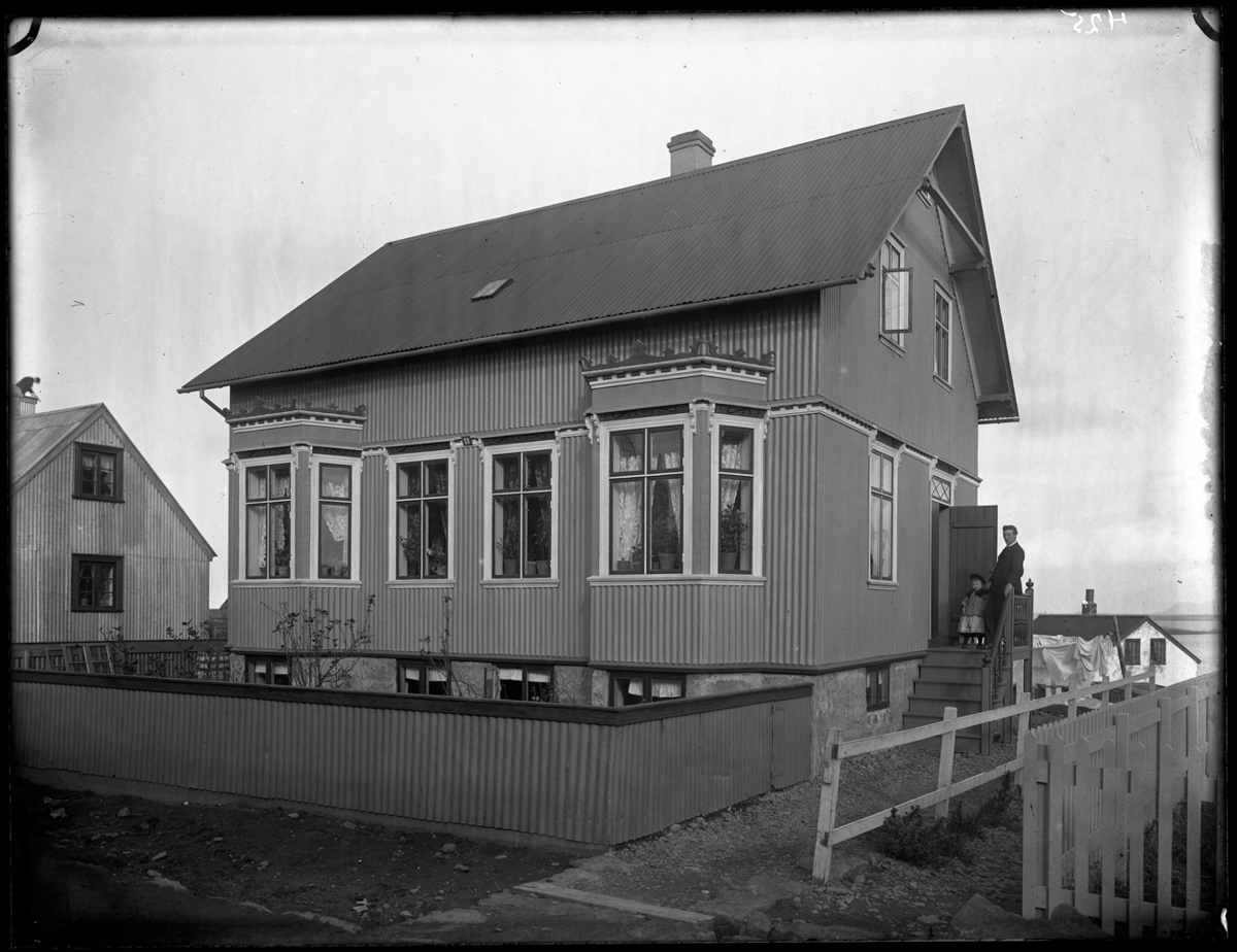Timburhús með tveim útskotum og miklum gluggaskreytingum. Maður og barn standa á tröppum hússins. Girðing úr bárujárni umlykur húsið. Þvottur á snúru. Sér í næstu hús og er maður ofan á þaki eins þeirra með sög. Grindverk ofl.