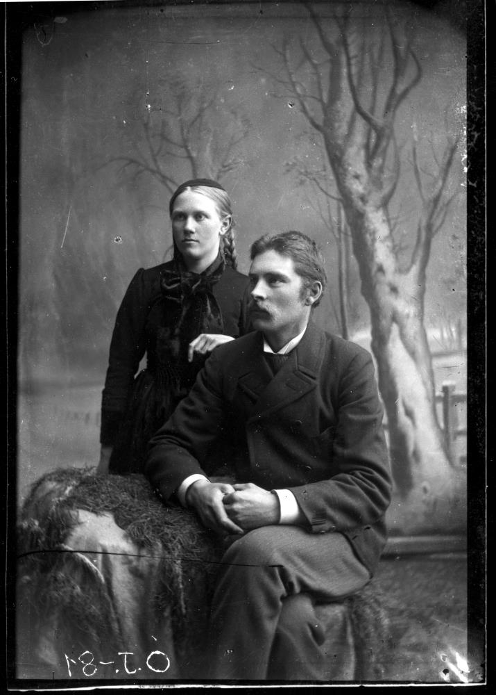 Baktjald og tilbúin heysáta eru til vitnis um að myndin er tekin á ljósmyndastofu Sigfúsar Eymundssonar. Hjónin Ragnheiður Guðrún Einarsdóttir og Stefán Gíslason læknir. Ragnheiður var fyrri kona Stefáns.