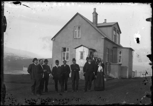 Fólk við hús. Brekka í Fljótsdal. Yst t.v. Halldór Benediktsson b. á Skriðuklaustri, Jónas Kristjánsson eða Guttormur í Geitagerði. Yst th. sr. Þórarinn, frú Ragnheiður. Sjúkrahúsið gamla byggt um 1906, brann 1942-43 eða 43-44.