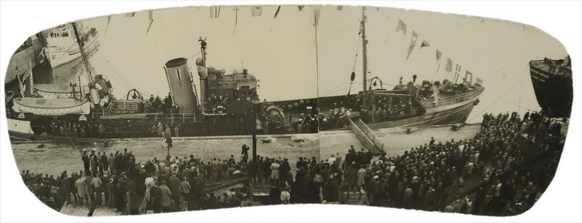 „INGÓLFUR ARNARSON RE 201.Skipinu fagnað 16. febrúar 1947.“ (BÞ 2020)
