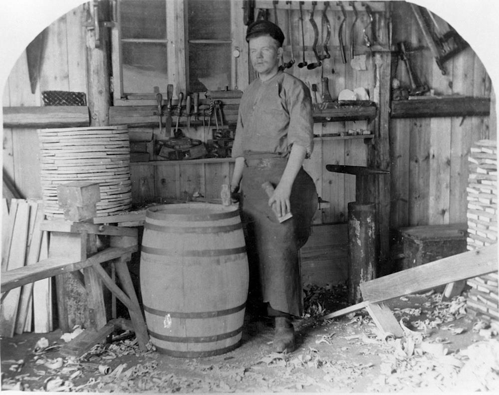 á vegg. Beykirinn er með svuntu og heldur á drifholti og sleggju og er