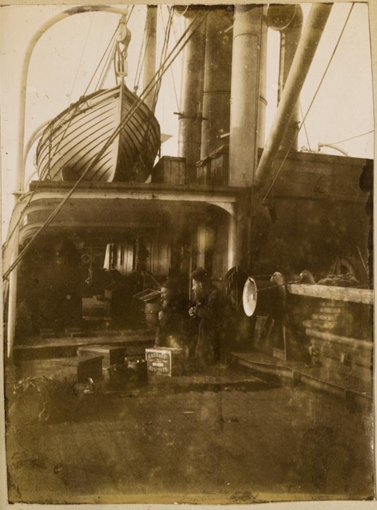 Farþegar um borð í strandferðarskipi. Mennirnir sitja á dekki með kassa hjá sér. Björgunarbátur. Undir myndina er skrifað á frönsku: Færeyingar um borð í Botníu 1913.