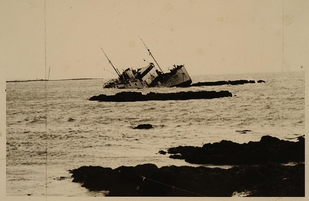 „Flóaskipið LAXFOSS á strandstað við Örfyrisey 10.01-04.03. 1944. Laxfoss var í siglingum milli Reykjavíkur og Borgarness. Laxfoss náðist út og fékk viðgerð en strandaði aftur við Kjalarnes 1952 og eyðilagðist.“ (Birgir Þórisson 2013)