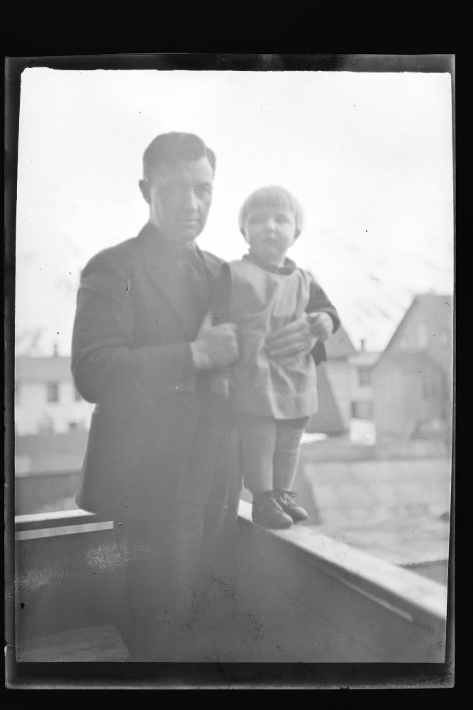 Siglufjörður. Eyrargata 11. Maður heldur utanum stelpu sem stendur á kanti á svölum eða tröppum. Nils Ísaksson með Dórótheu.